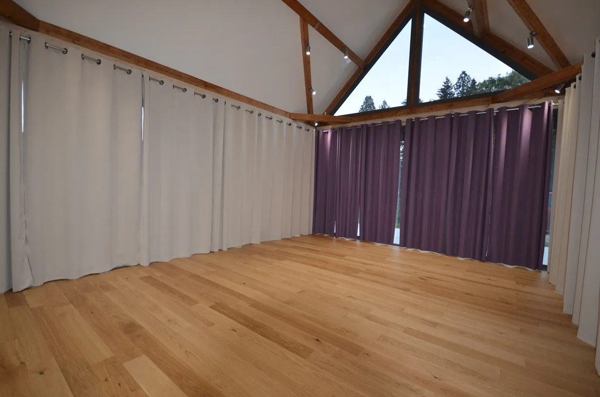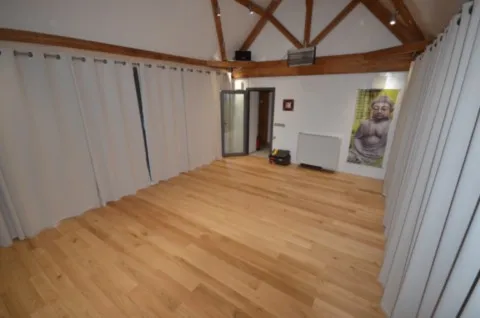 Salle de 27m2 avec parquet de chêne, rideaux sur 3 côtés, stores extérieurs, sonorisée
